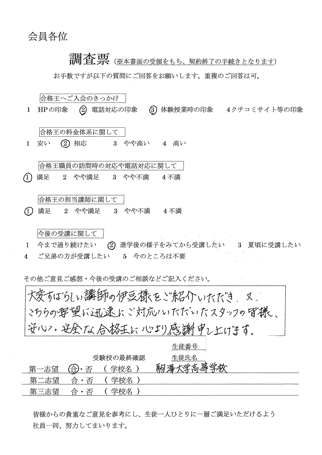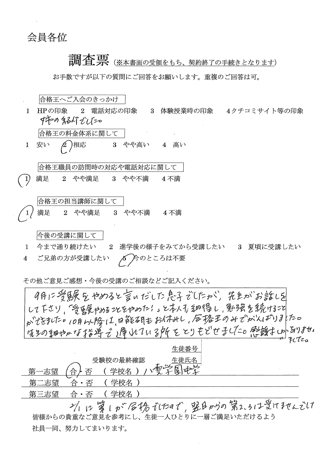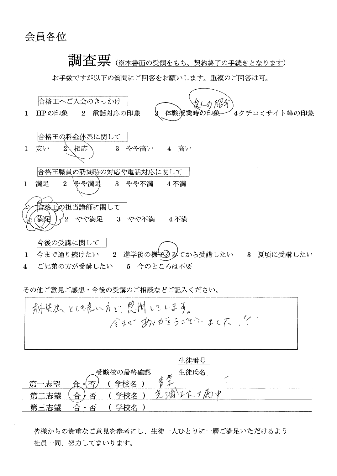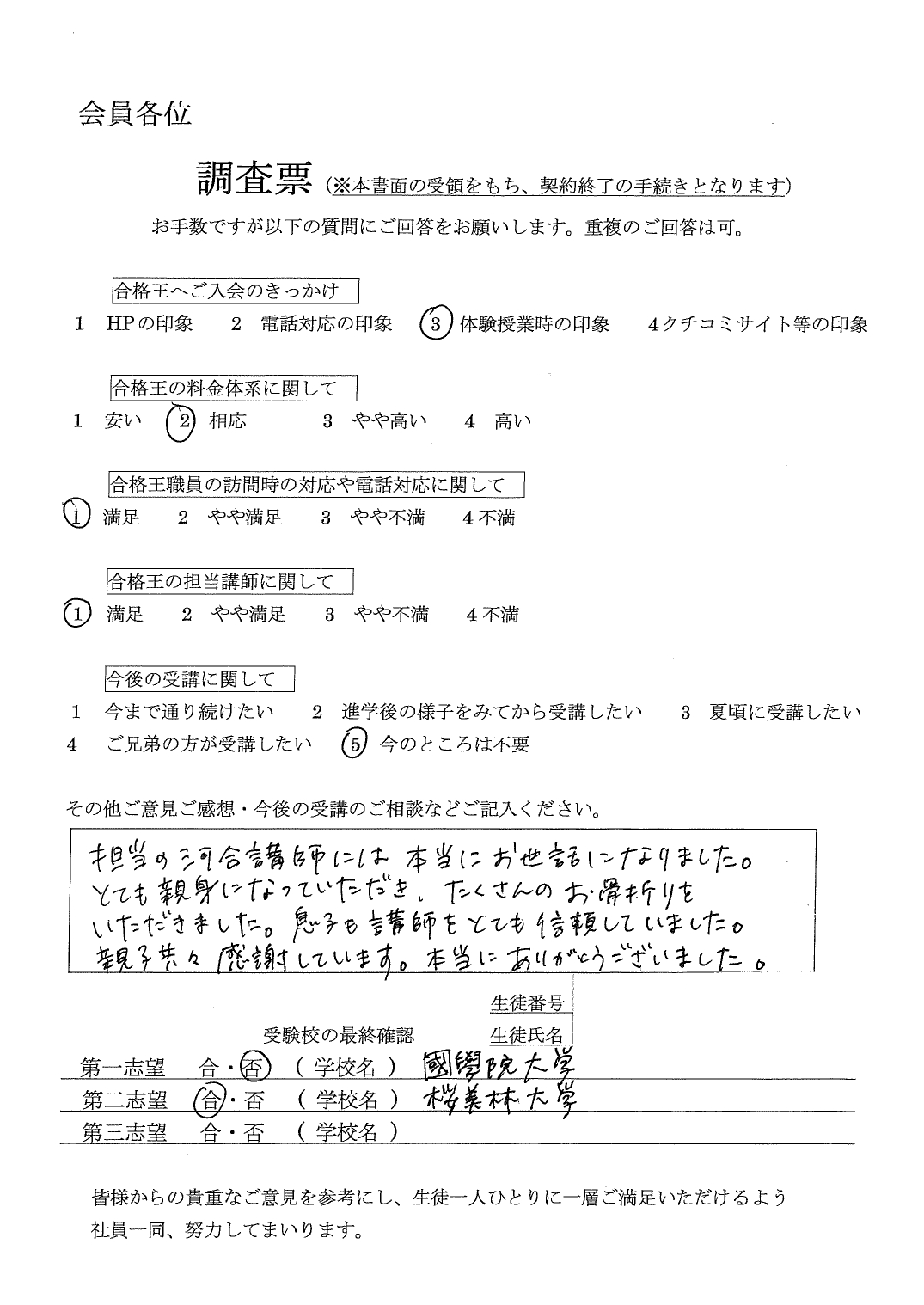 合格王からいただく連絡の電話などいつもていねいで、とても感じがよかったです。先生との関係も良好で信頼できる方でした。
