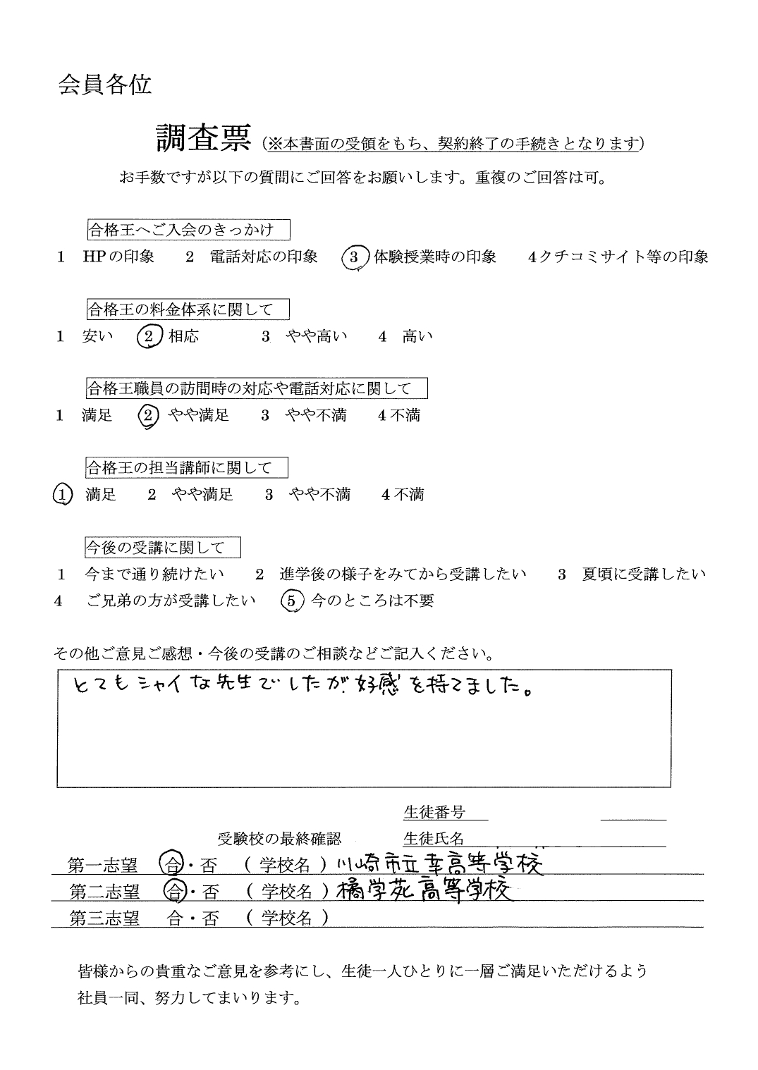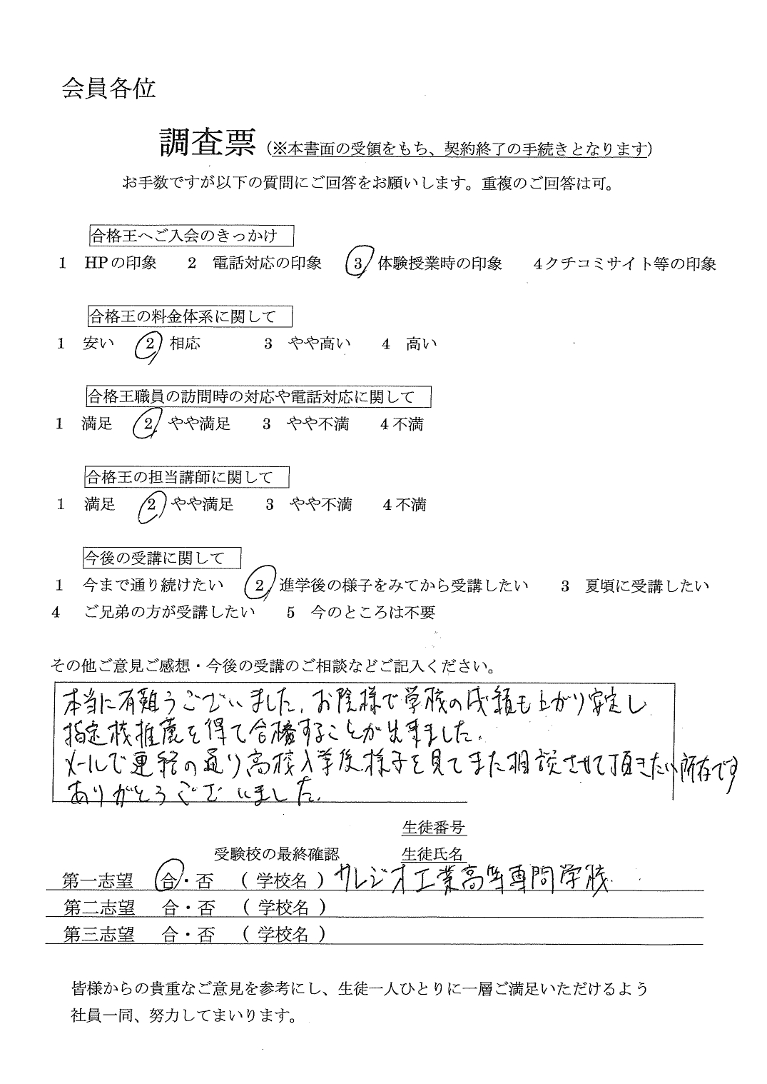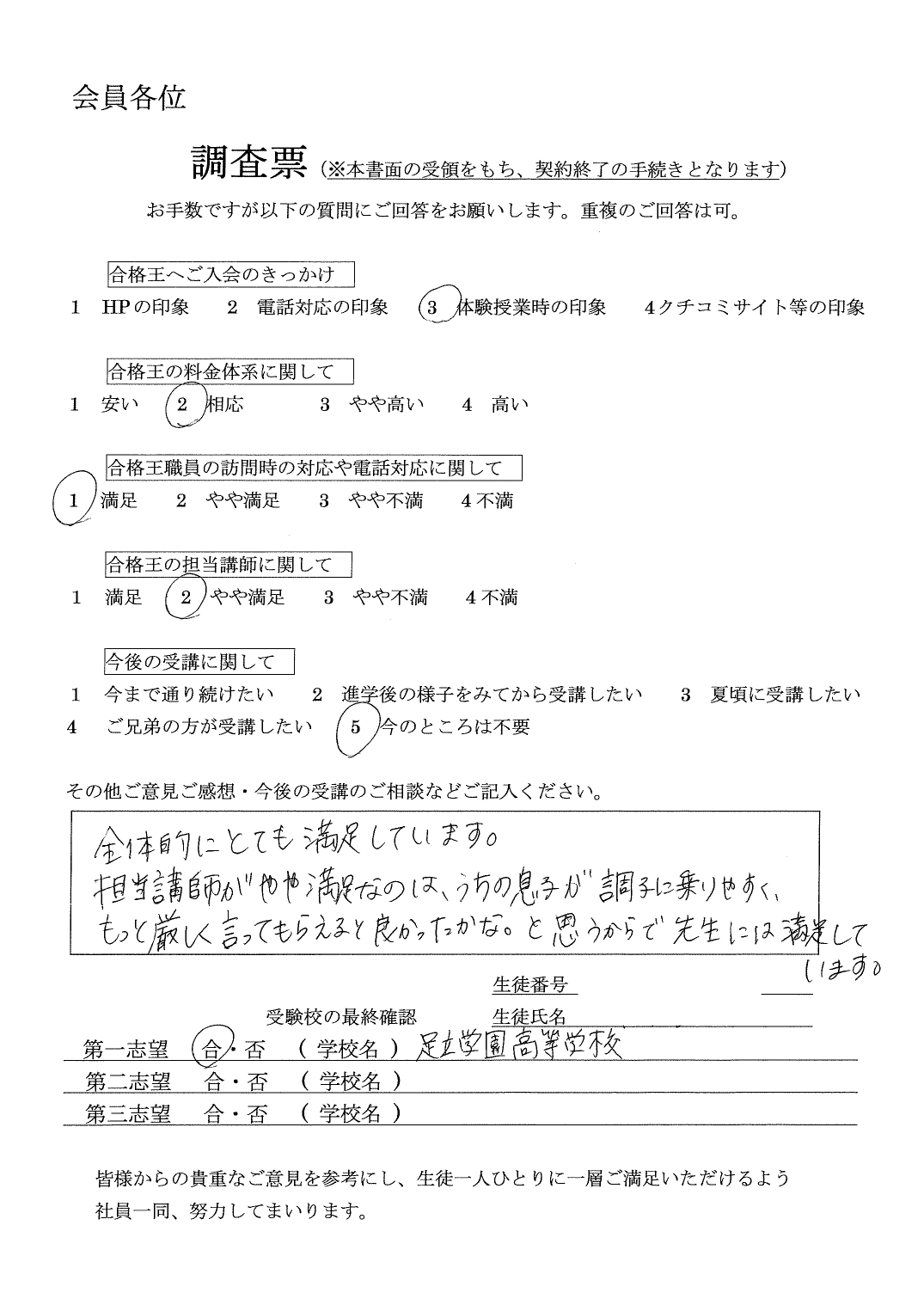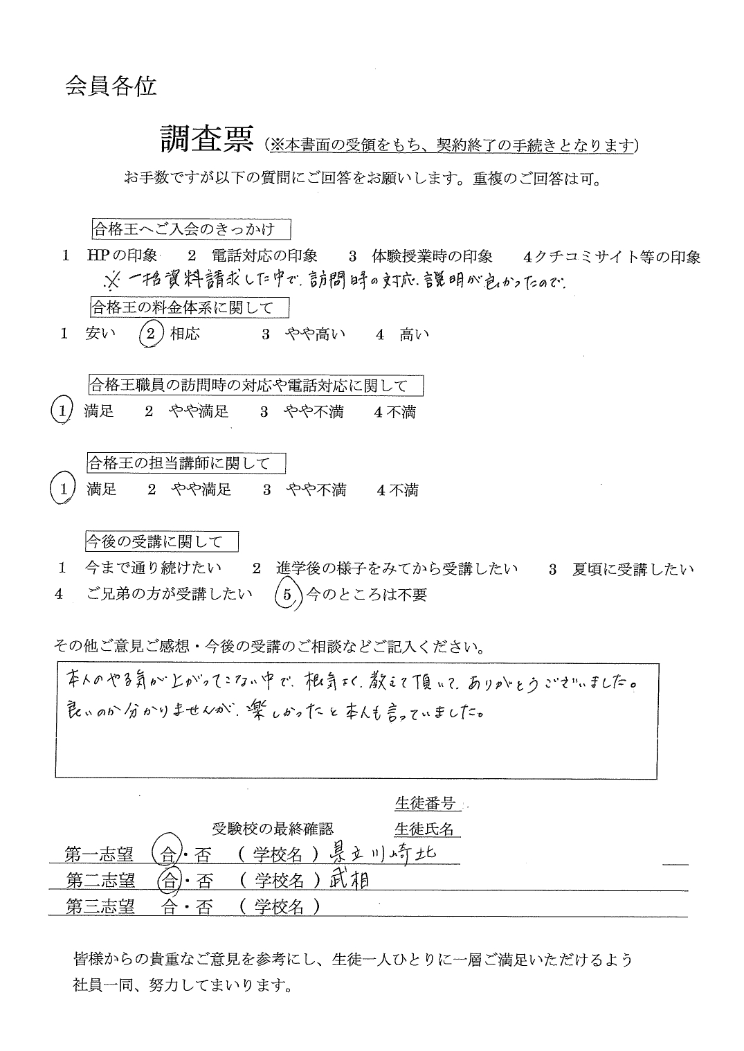 合格王からいただく連絡の電話などいつもていねいで、とても感じがよかったです。先生との関係も良好で信頼できる方でした。