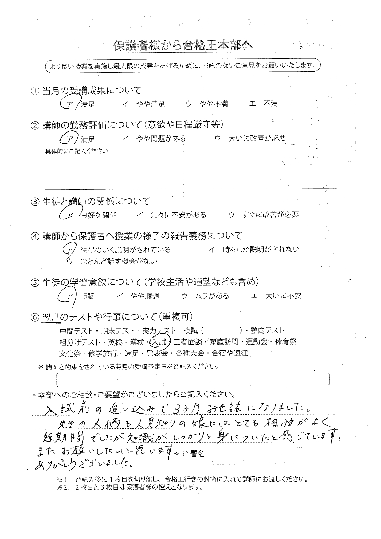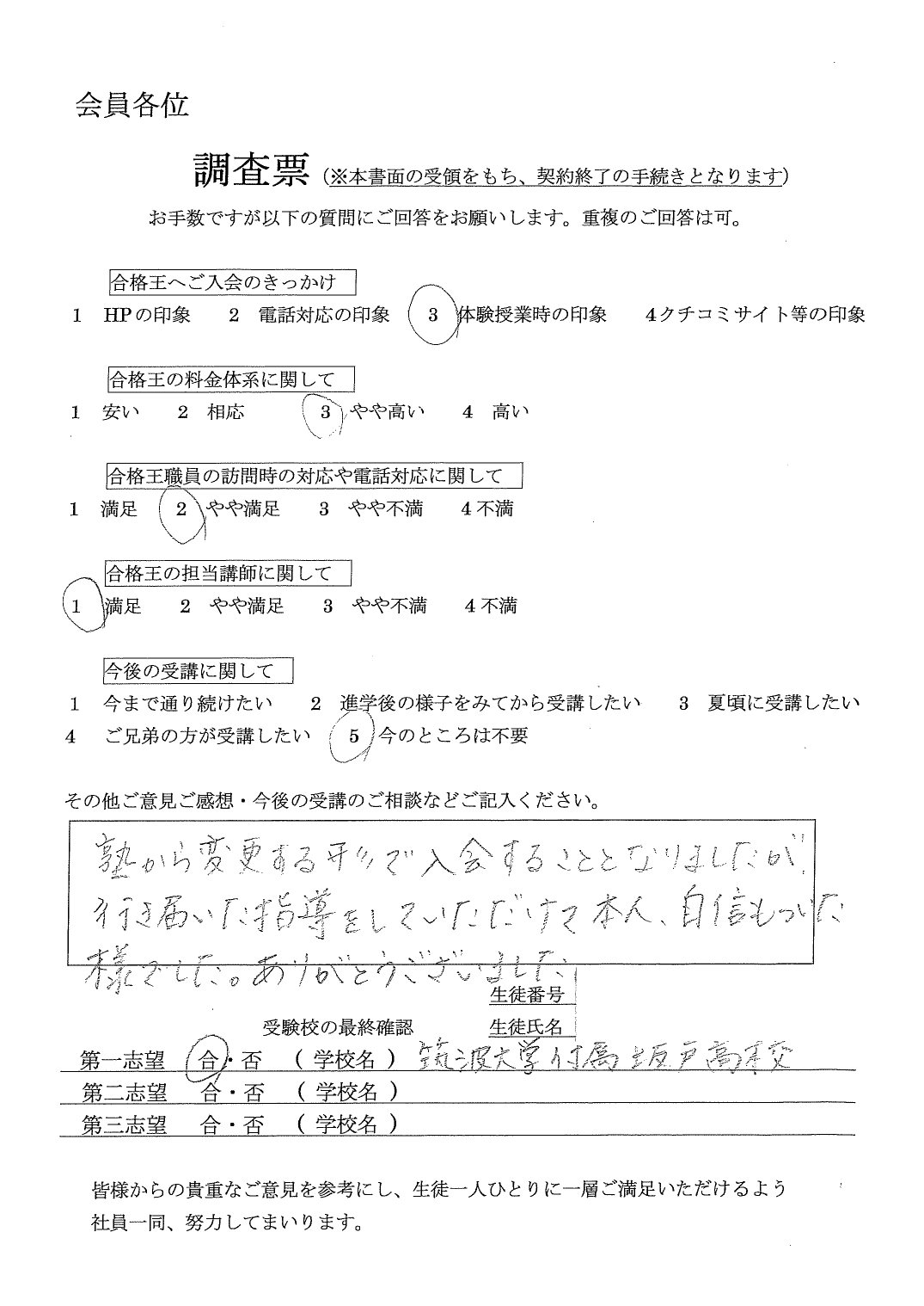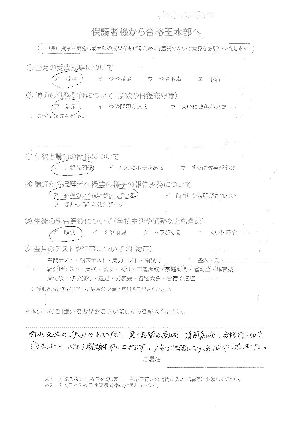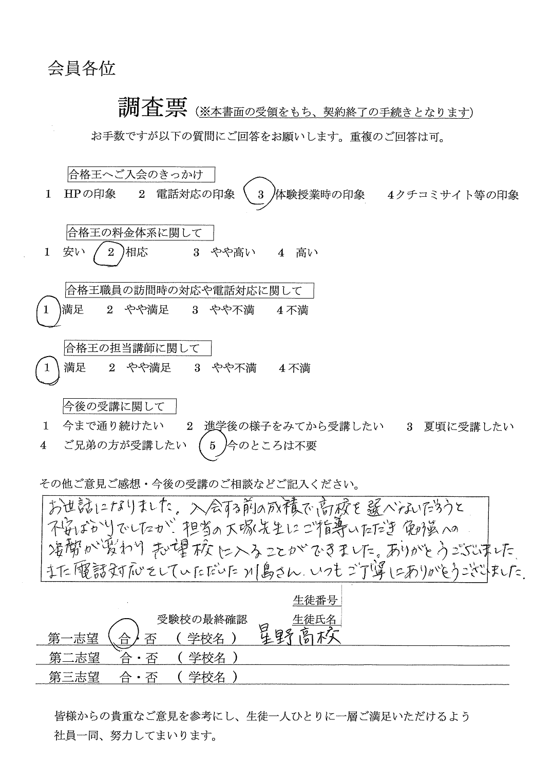 合格王からいただく連絡の電話などいつもていねいで、とても感じがよかったです。先生との関係も良好で信頼できる方でした。