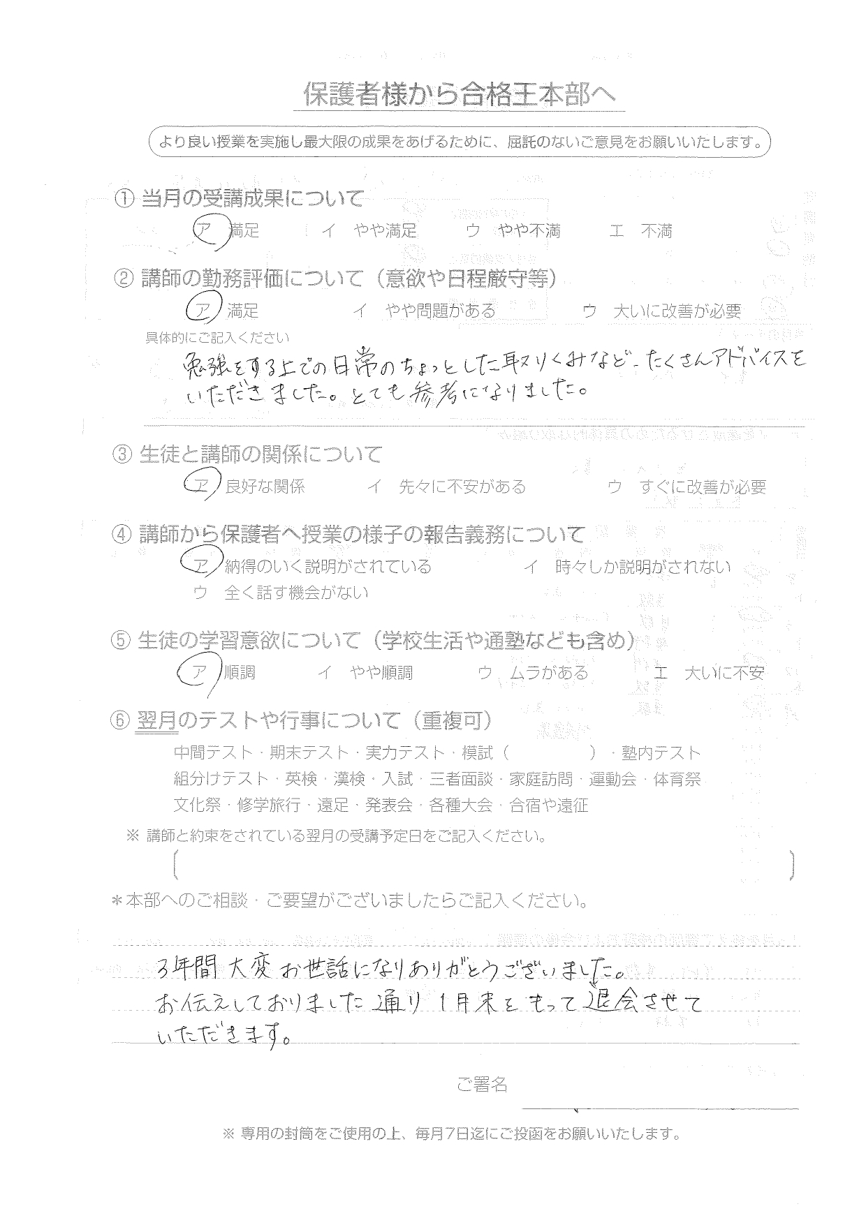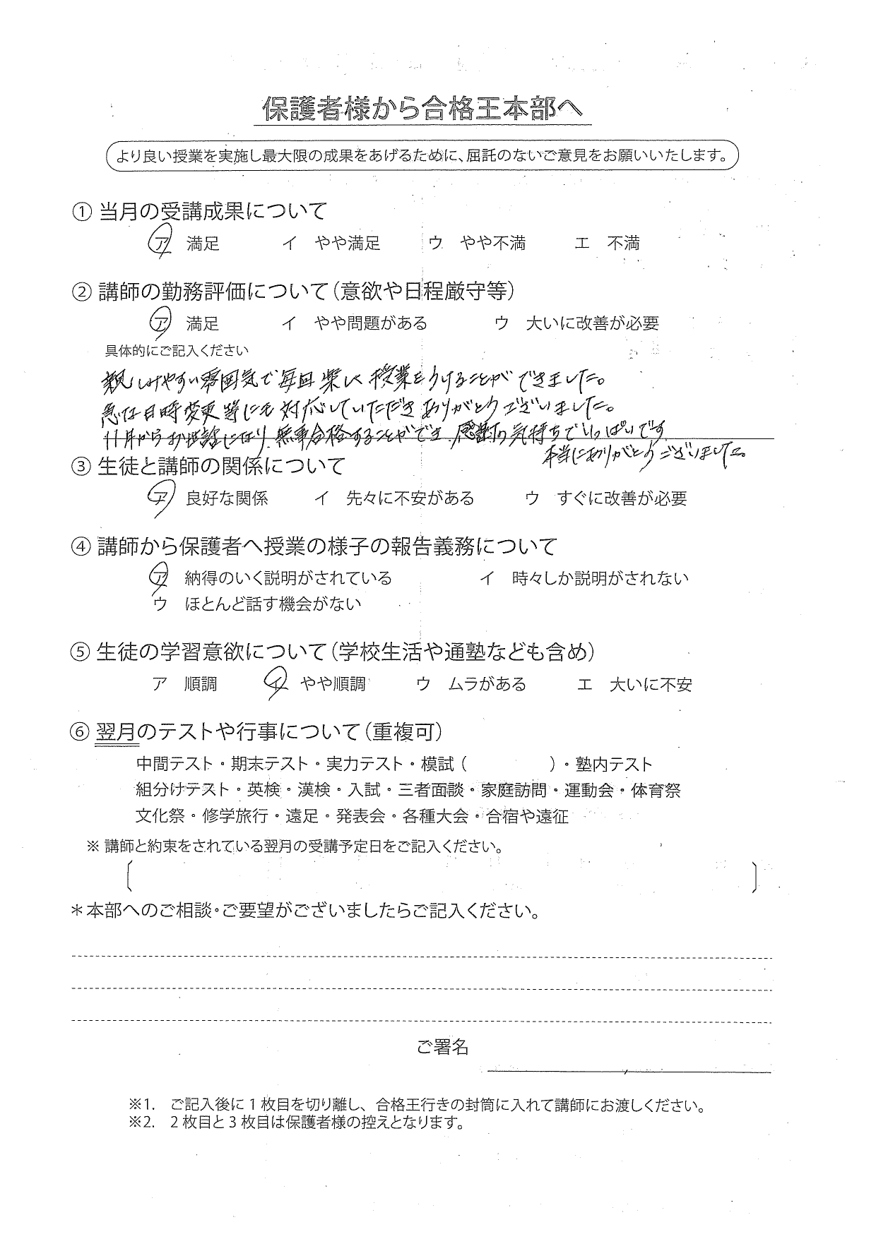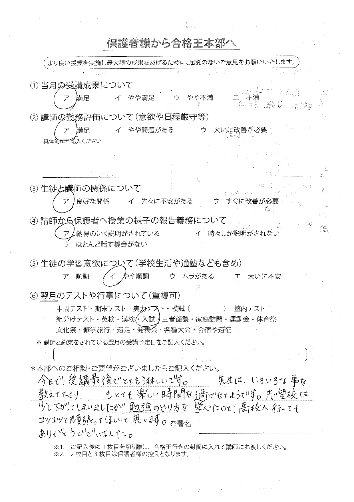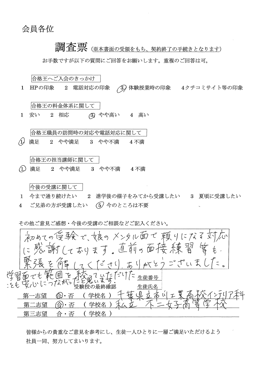 合格王からいただく連絡の電話などいつもていねいで、とても感じがよかったです。先生との関係も良好で信頼できる方でした。