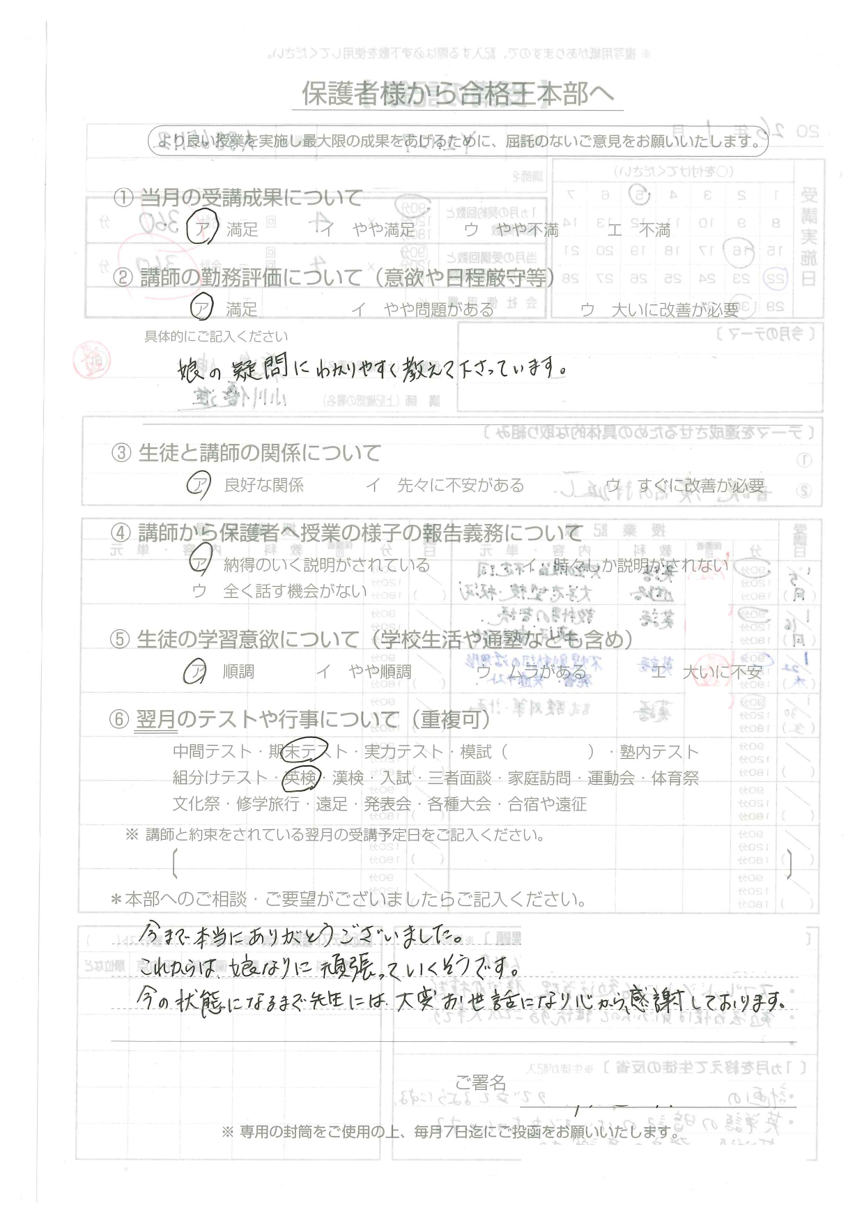 毎回、分かりやすく娘の目線になって授業をしてくださり、本当に感謝の気持ちでいっぱいです。