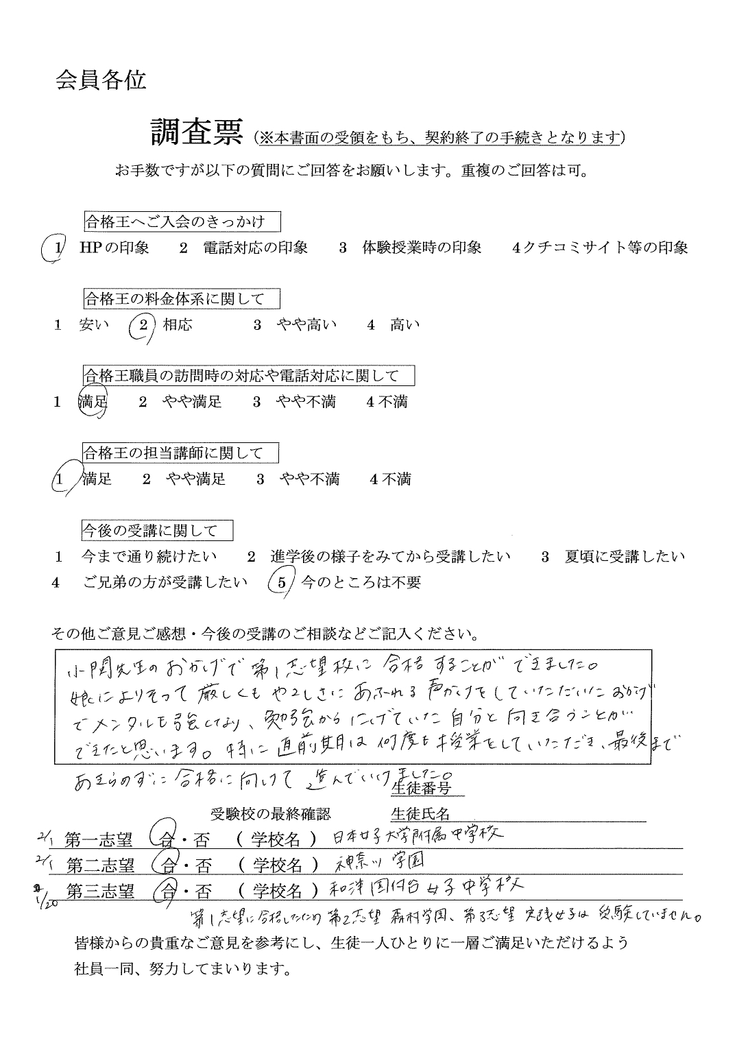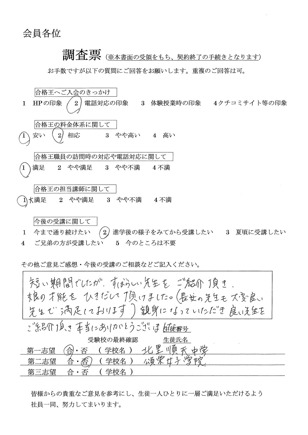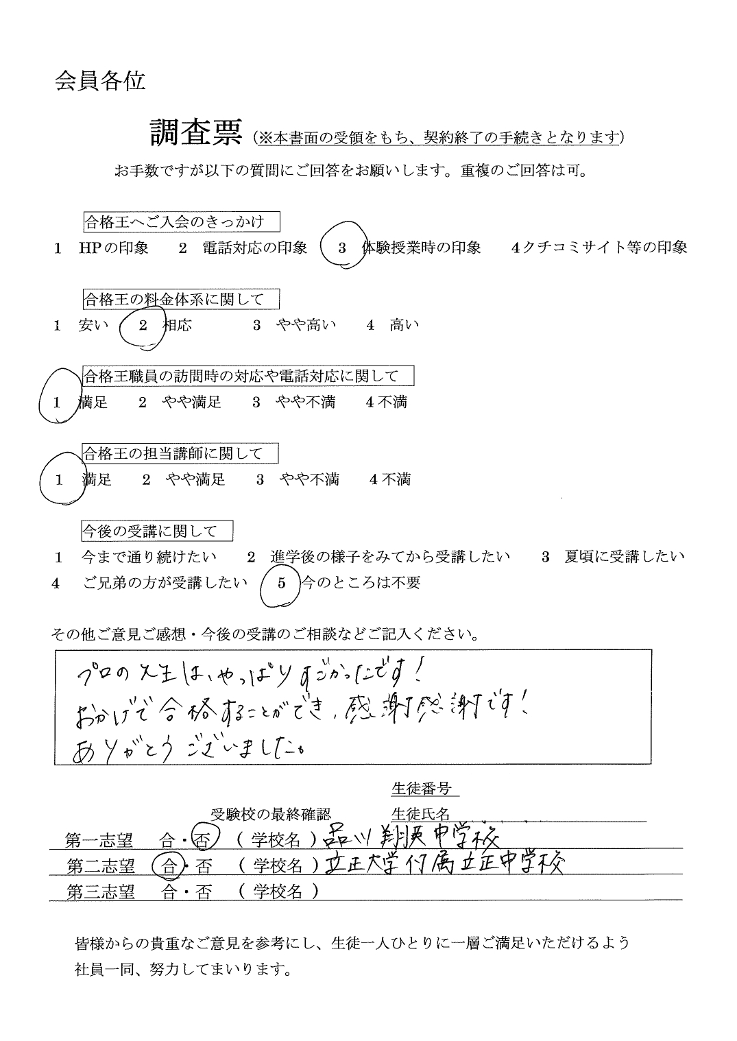 第一志望には届きませんでしたが、第二志望の特待合格を頂き、とても喜んでいます。大変お世話になりました。受験校の最終確認