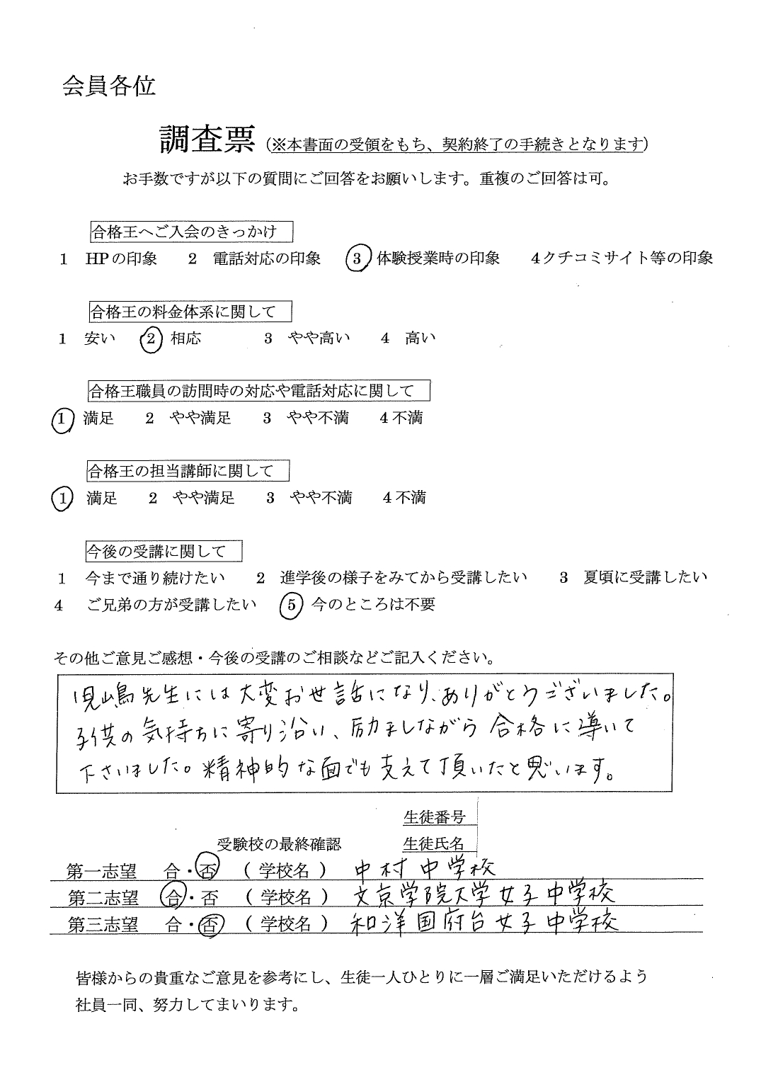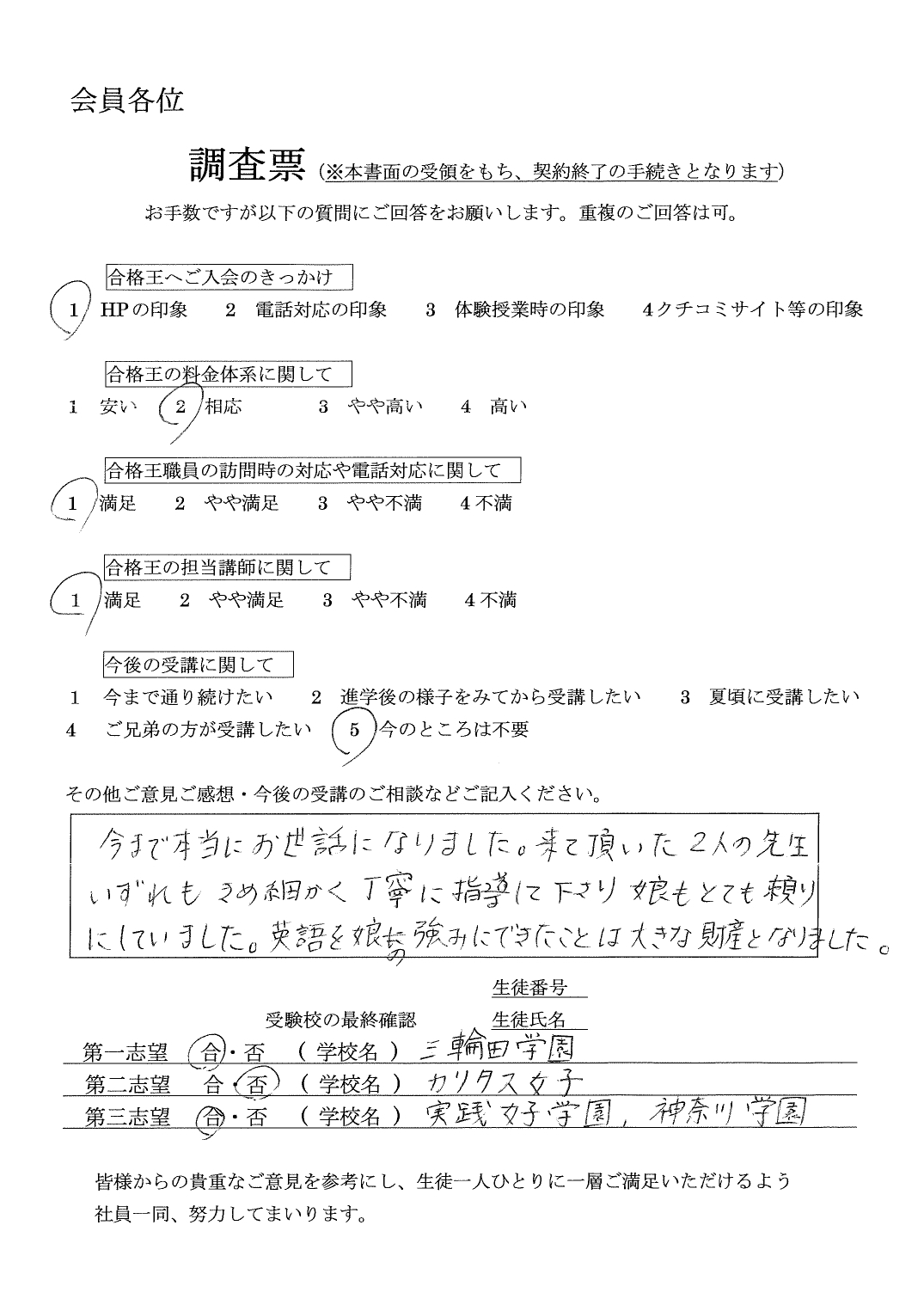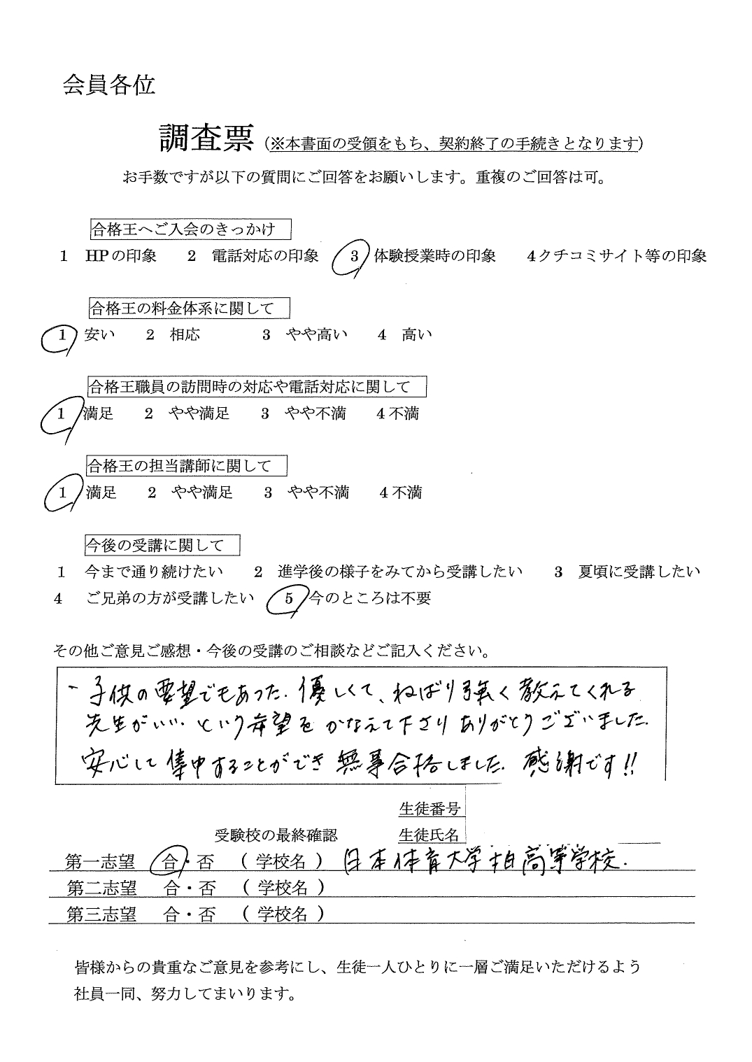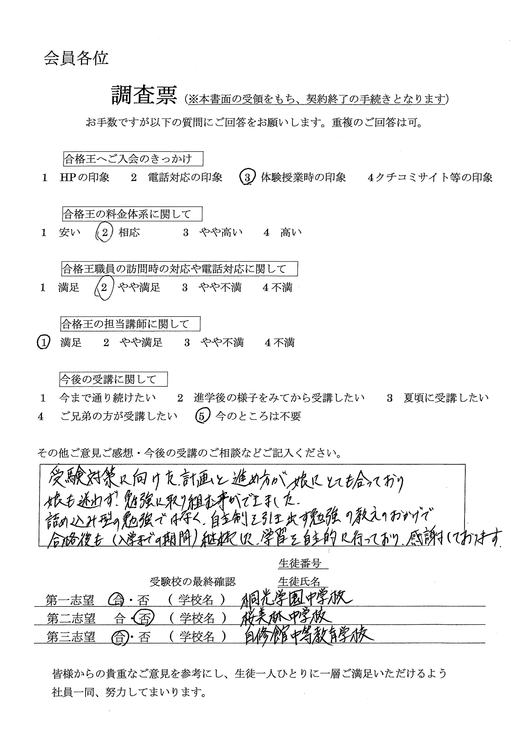 第一志望には届きませんでしたが、第二志望の特待合格を頂き、とても喜んでいます。大変お世話になりました。受験校の最終確認