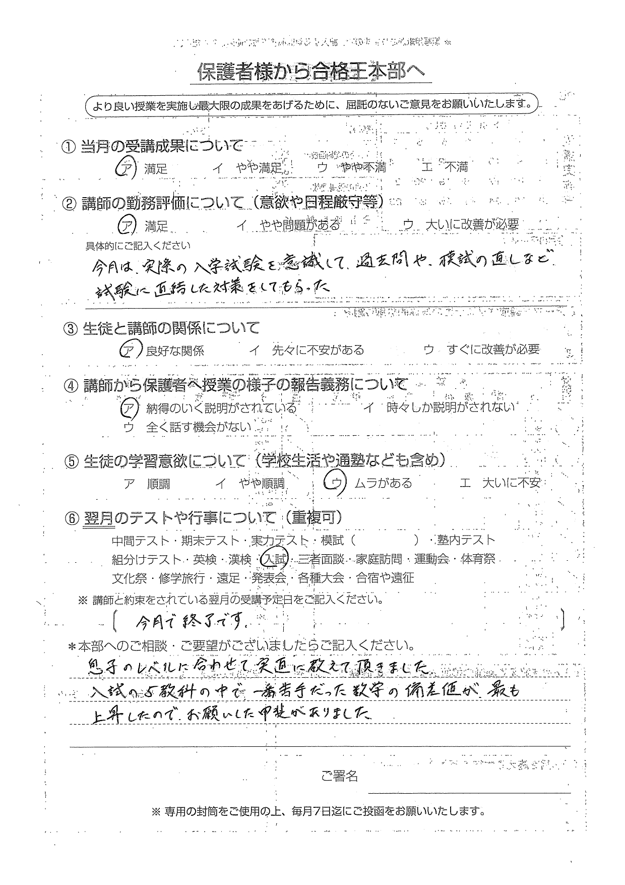 1年2ヶ月有難うございました。この一年間でどれだけ成績が上がったのだろうと思う位、良く勉強していました。