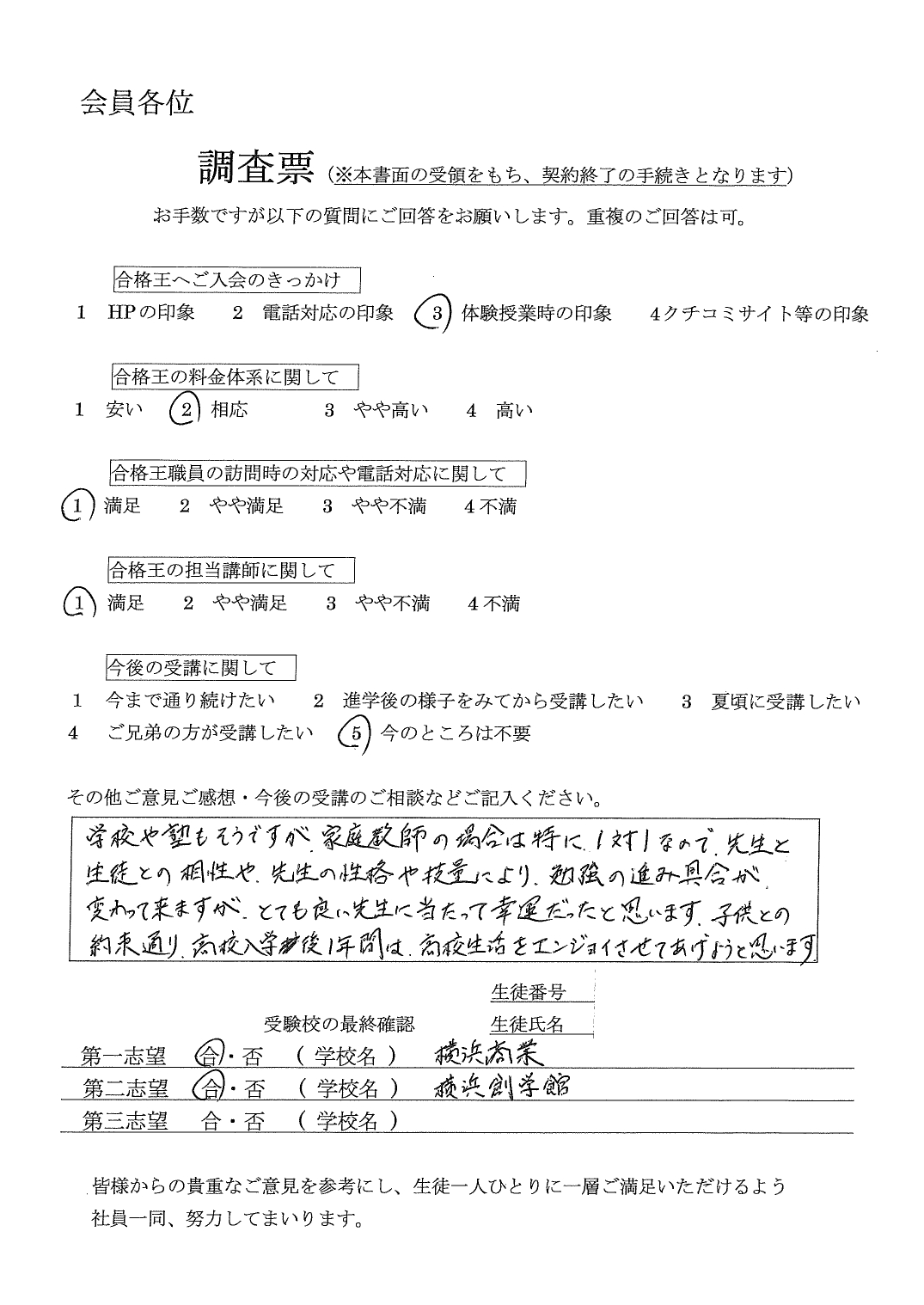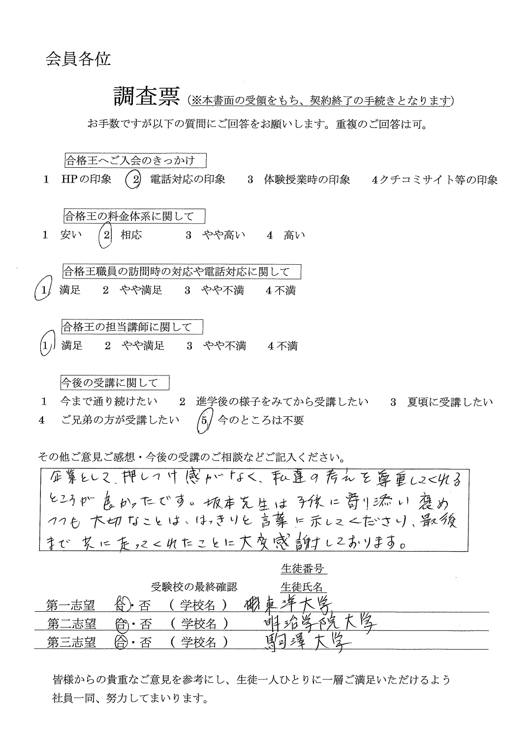 以前別会社の家庭教師にお願いしていましたが、御社の先生の指導力や、社員の方の対応のレベルが、かなり高いと思います。今まで、ありがとうございました。受験校の最終確認