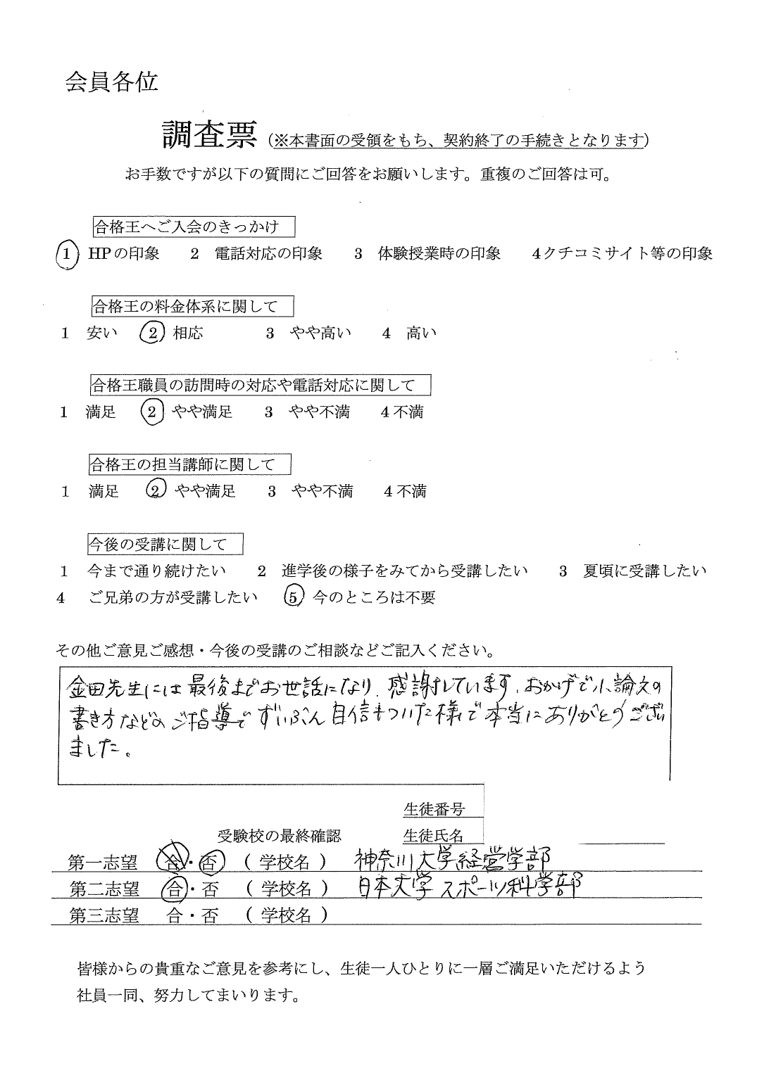 2021年から長い間大変お世話になりました。先生をはじめ、合格王さんの対応に大変満足しています。